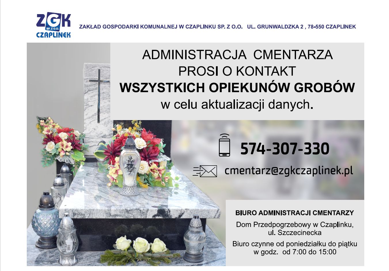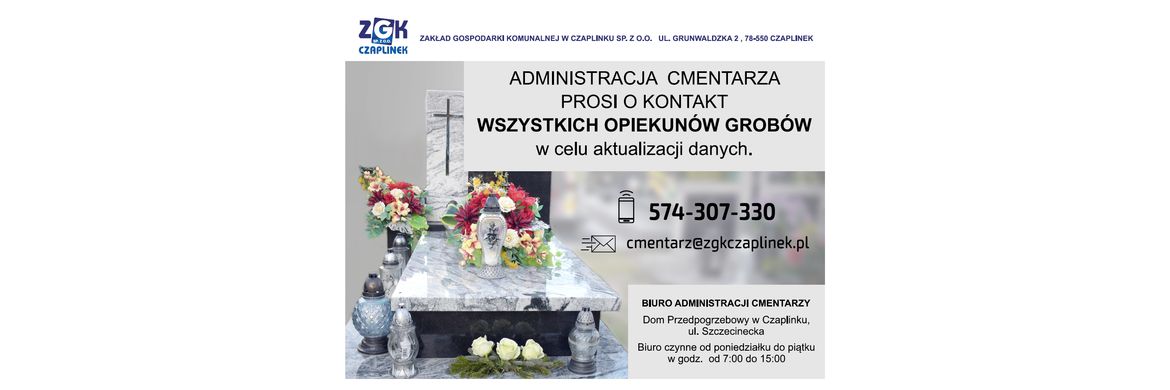 Administracja cmentarza służy Państwu pomocą w poniedziałki, wtorki, środy, piątki w godzinach od 7:00 do 15:00 oraz w czwartki w godzinach od 07:00 do 17:00 w biurze umiejscowionym w Domu Przedpogrzebowym (kaplica) na terenie cmentarza komunalnego w Czaplinku, a także pod numerami telefonu 574 307 330, 697 776 674 ewentualnie prosimy kierować wiadomości drogą mailową cmentarz@zgkczaplinek.pl .