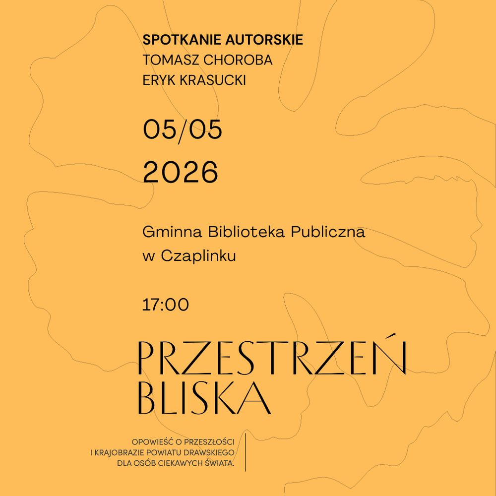 Gminna Biblioteka Publiczna w Czaplinku zaprasza na spotkanie autorskie, które odbędzie się 5 maja 2026 r. o godz. 17.00. Gośćmi wydarzenia będą Tomasz Choroba oraz Eryk Krasucki – autorzy książki „Przestrzeń bliska. Opowieść o przeszłości i krajobrazie powiatu drawskiego dla osób ciekawych świata”. Publikacja, jak podkreśla wydawca, skierowana jest do czytelników zainteresowanych odkrywaniem lokalnej historii i lepszym poznawaniem najbliższego otoczenia.